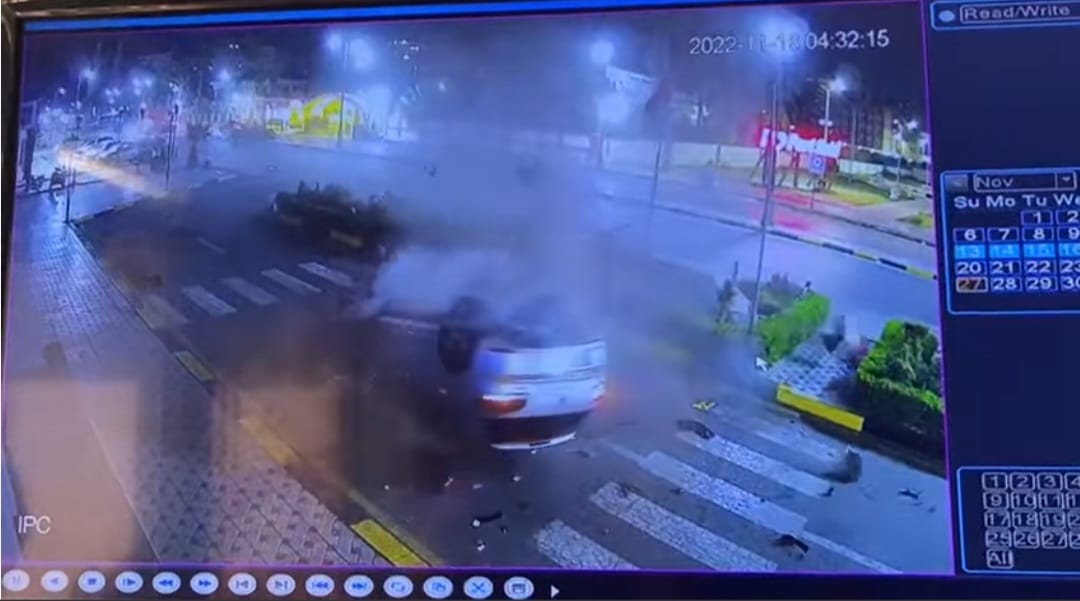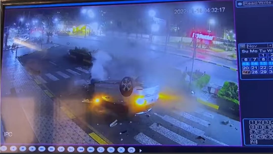 ورصدت كاميرات المراقبة سيارة ملاكي موديل حديث بيضاء اللون تأتي مسرعة من شارع طرح البحر بسرعة جنونية، لتصطدم بعمود إنارة وتنقلب على رصيف وتتجاوز حواجز إحدى القرى السياحية، وتستقر أمام أبواب القرية في مشهد مؤلم.
