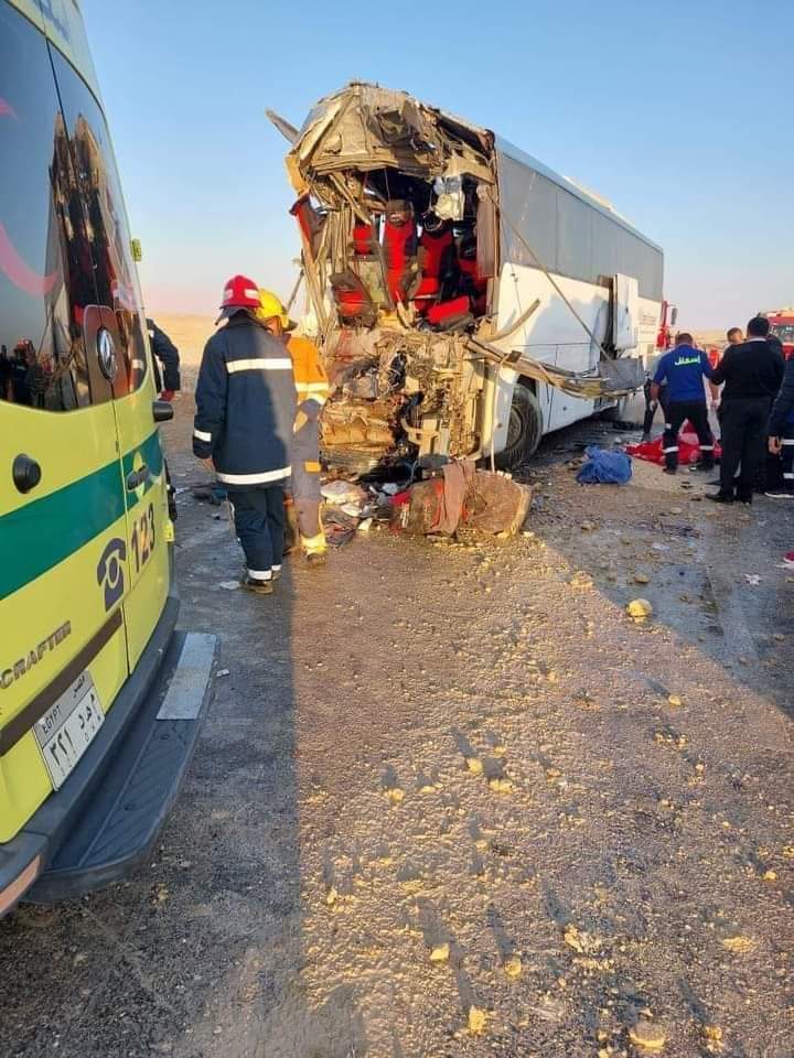 فيما وقع حادث تصادم تسبب في مصرع وإصابة أكثر من 40 شخصا في حادث تصادم أتوبيس بسيارة نقل تريللا بطريق رأس غارب.
