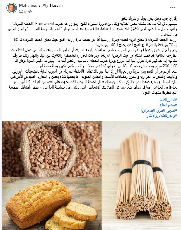 وكتب الدكتور محمد سيد حسن في تدوينة عبر صفحته بالفيس بوك: "اقتراح جديد ممكن يكون بديل أو شريك للقمح.. سيسهم بإذن الله فى حل مشكلة مصر الغذائية ويقلل من فاتورة استيراد القمح. وهو زراعة حبوب Buckwheat "الحنطة السوداء" والتي نحصل منها على طحين (دقيق) الذي يتمتع بقيمة غذائية عالية يصنع منه السوبا نودلز "الشعرية سريعة التحضير" والخبز الخالي من الجلوتين."