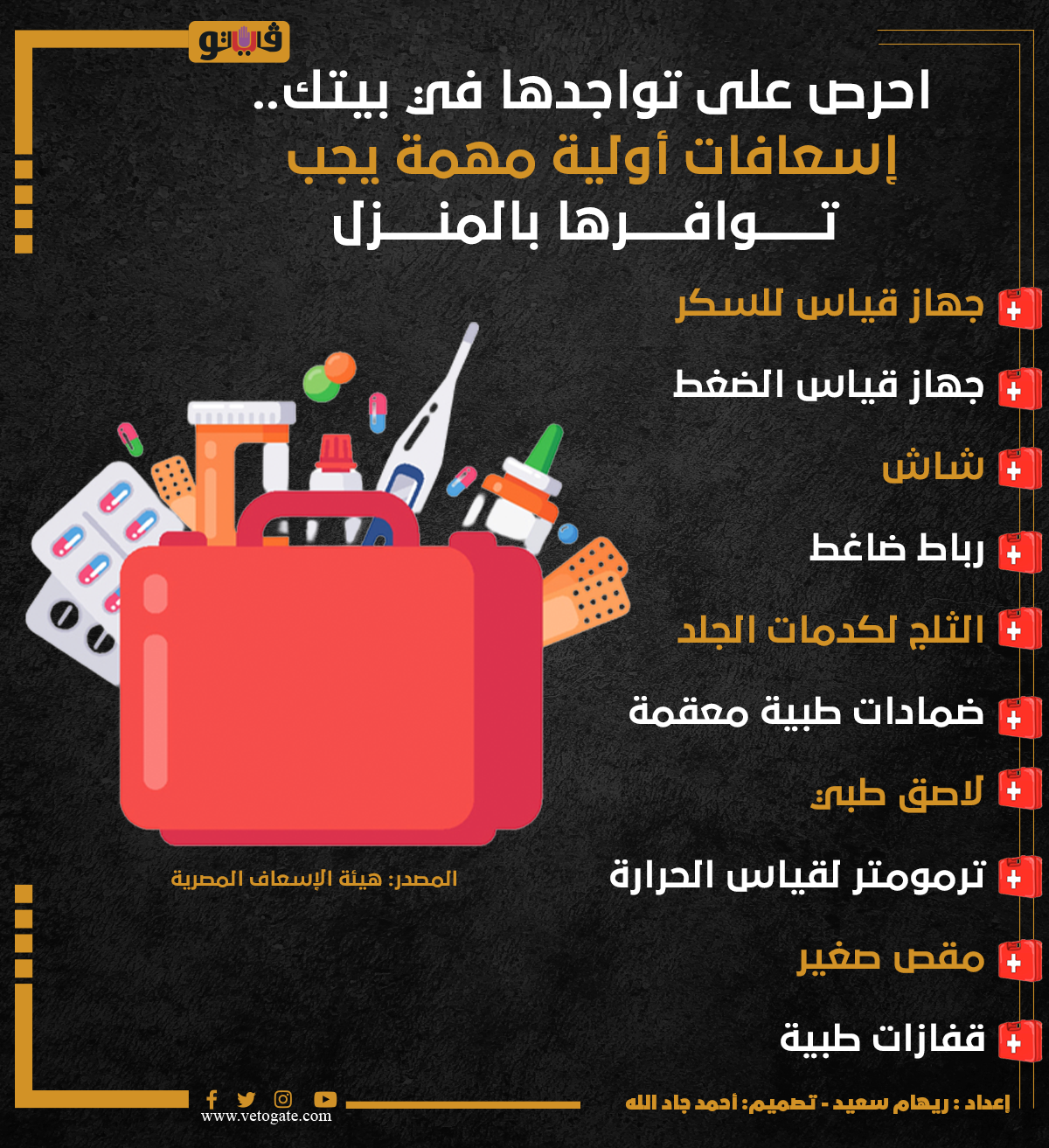 احرص على تواجدها في بيتك.. إسعافات أولية مهمة يجب توافرها بالمنزل| انفوجراف الثلاثاء 22/نوفمبر/2022 - 02:05 م 11/22/2022 2:05:34 PM الاسعافات الاولية ريهام سعيد شارك طباعة 18 حجم الخط شارك طباعة هيئة الاسعاف المصري جهاز قياس الضغط هيئة الإسعاف المصرية قياس الضغط هيئة الإسعاف