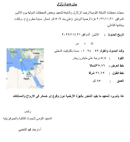 وسجلت فى تمام الساعة الواحدة و24 دقيقة صباحا، بالتوقيت المحلى بقوة 5.8 ريختر، خط عرض 35.86 شمالا، وخط طول 26.62 شرقا بعمق 85 كم.