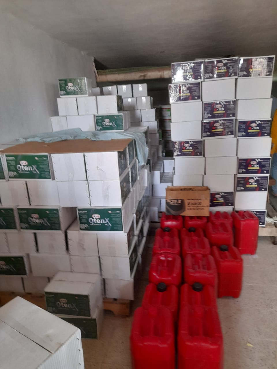 وتمكنت الحملة من ضبط مصنع لتعبئة الشحوم وزيوت سيارات بدون ترخيص من الجهات المختصة وجري تحريز، ماكينة تعبئة شحوم بداخل المصنع،ماكينة طباعة تاريخ الانتاج والصلاحية. ٢٠٠ جالون زن الجالون ١٣ كجم غير مدون عليها بيانات،و ٢٠٠ جالون زنه الواحد ٢٠ لتر غير مدون عليها بيانات، ٥٠ جالون زنة الجالون ٢٠ لتر غير مدون عليها بيانات.٥٠ جالون بزنة الواحد ٢٠ لتر غير مدون عليها بيانات، ٢٠٠ جالون x ١٣ كجم غير مدون عليها بيانات،٥٠ جالون x ١٦ لتر بدون بيانات، ٢٠٠٠ عبوة فارغة تستخدم في التعبئة،٧٠٠ كيلو شحومات داخل جرادل بلاستيكية،٣٠٠ كيلو زيوت محركات بداخل براميل، عدد ١٥٠٠٠٠ لاصق على العبوات بعد التعبئة.