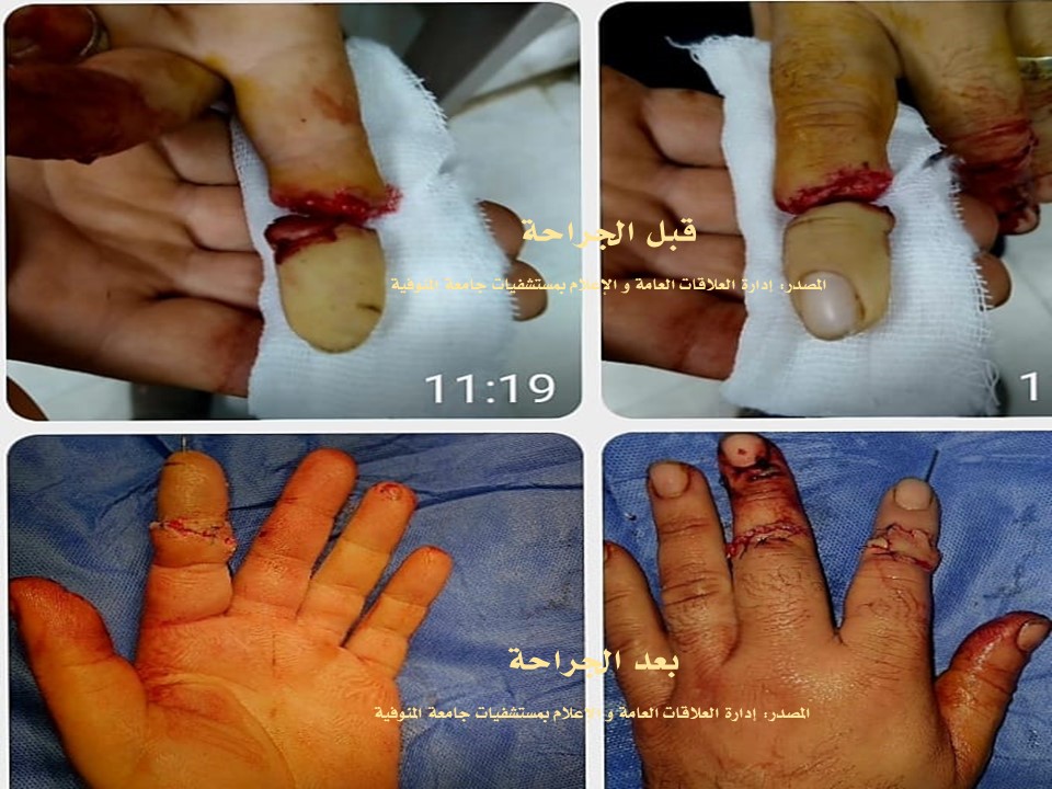 وأوضح الدكتور محمد مجاهد رئيس قسم جراحة التجميل والحروق بأن المريض حضر إلي طوارئ مستشفيات جامعة المنوفية يعانى من بتر كامل بالسلامية البعيدة وجزء من السلامية الوسطى بأصبع السبابة الأيس.