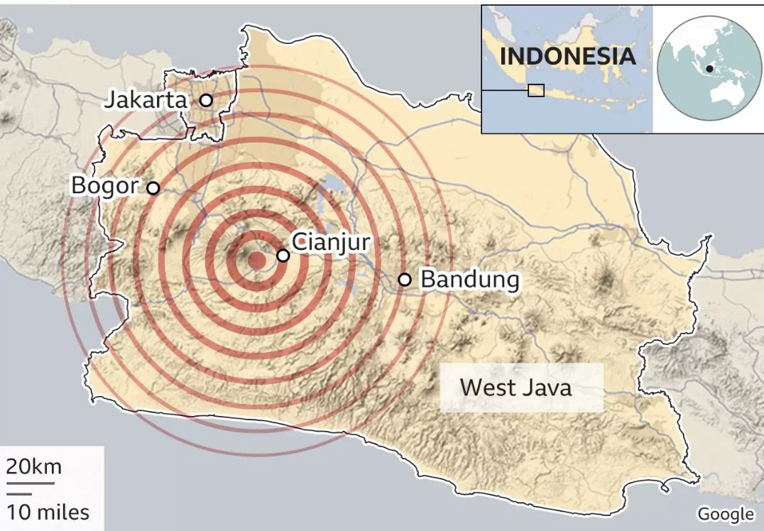 وكانت وكالة الأرصاد الجوية وعلوم المناخ والجيوفيزياء الإندونيسية قد أفادت في وقت سابق بأن شدة الزلزال بلغت 5.6 درجات، وعلى عمق 10 كيلومترات، وبأنه ضرب قرب بلدة سيانجور التي تبعد مسافة 100 كيلومتر عن جاكرتا.