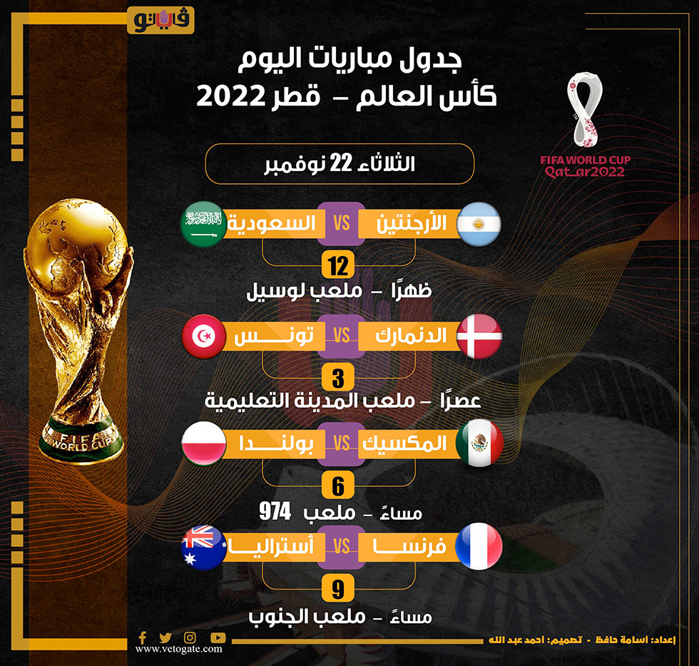 مواعيد مباريات كأس العالم اليوم الثلاثاء 22-11-2022 الثلاثاء 22/نوفمبر/2022 - 12:05 ص 11/22/2022 12:05:46 AM كأس العالم شارك طباعة 18 حجم الخط شارك طباعة قطر كأس العالم كأس العالم 2022 مواعيد مباريات كأس العالم