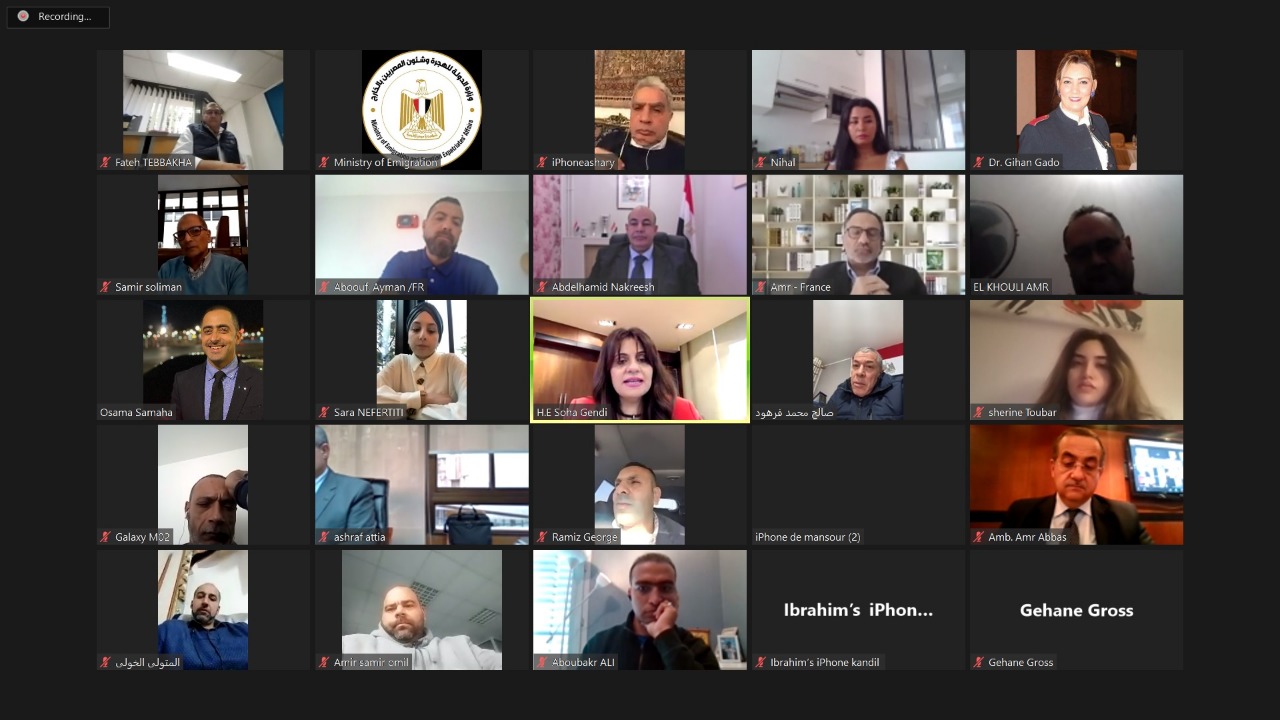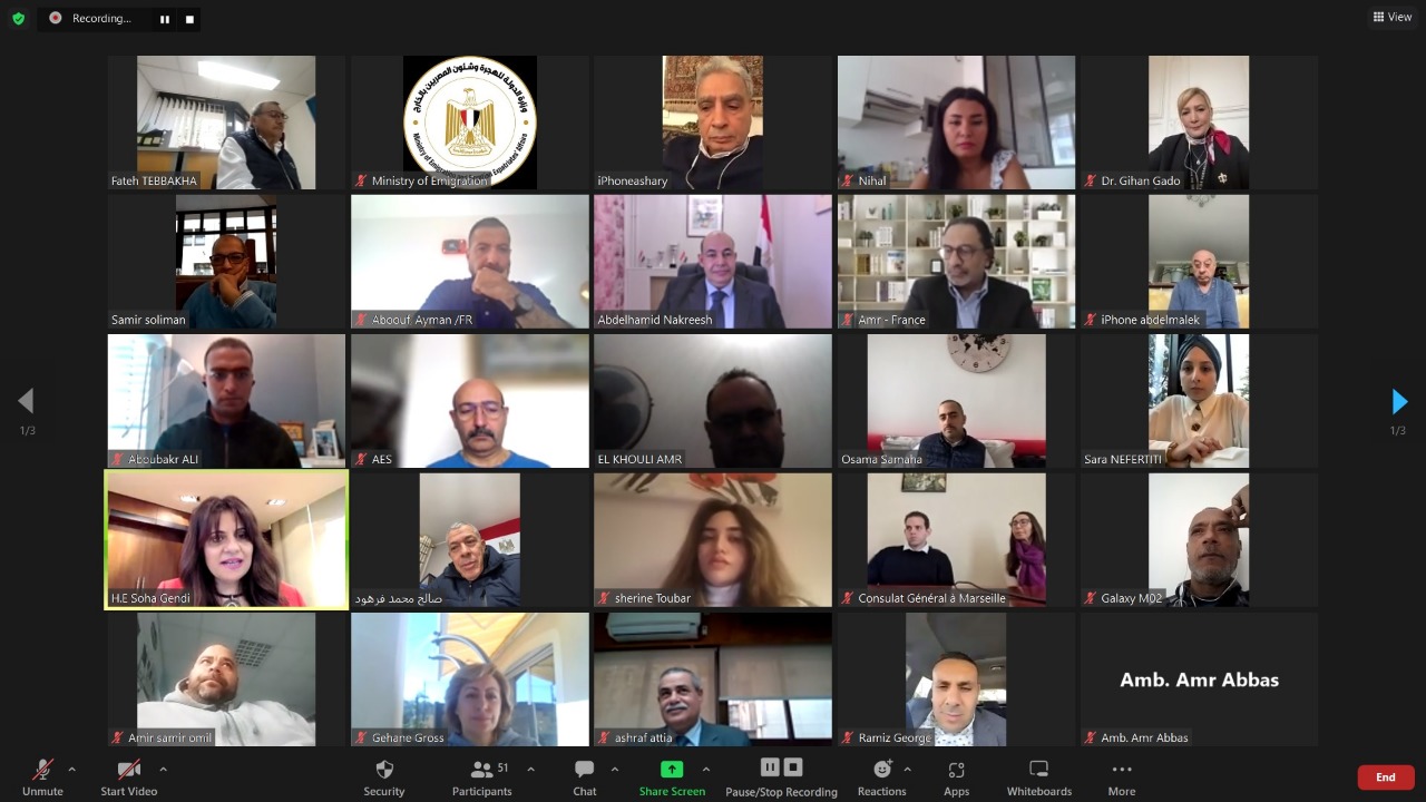 أدارت السفيرة سها جندي، وزيرة الدولة للهجرة وشئون المصريين بالخارج، لقاءها مع نحو 50 من أبناء الجالية المصرية بفرنسا عبر تطبيق "زووم"، في إطار مبادرة "ساعة مع الوزيرة".
