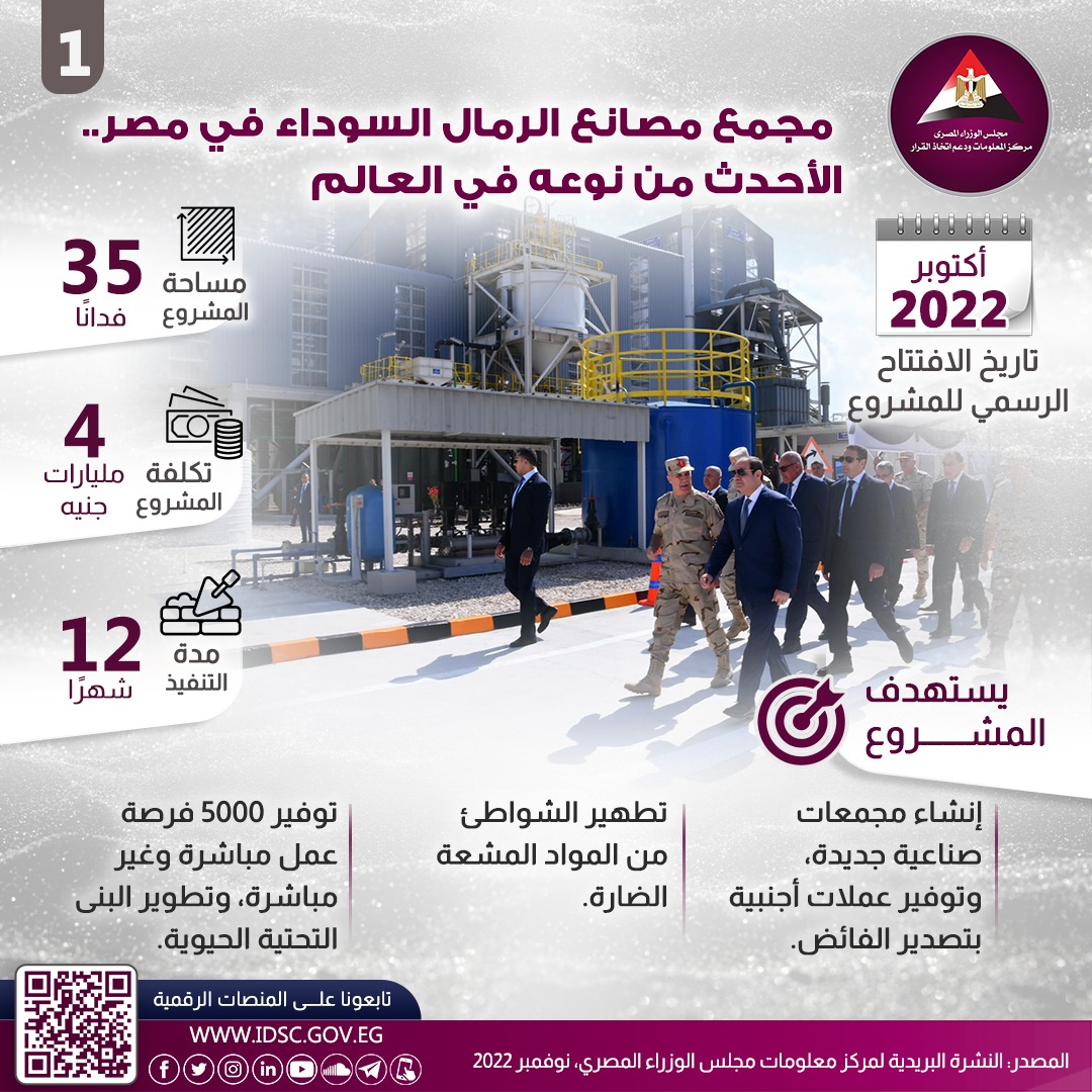 نشر مجلس الوزراء إنفوجرافا جديدا تحت عنوان "مجمع مصانع الرمال السوداء في مصر.. الأحدث من نوعه في العالم".