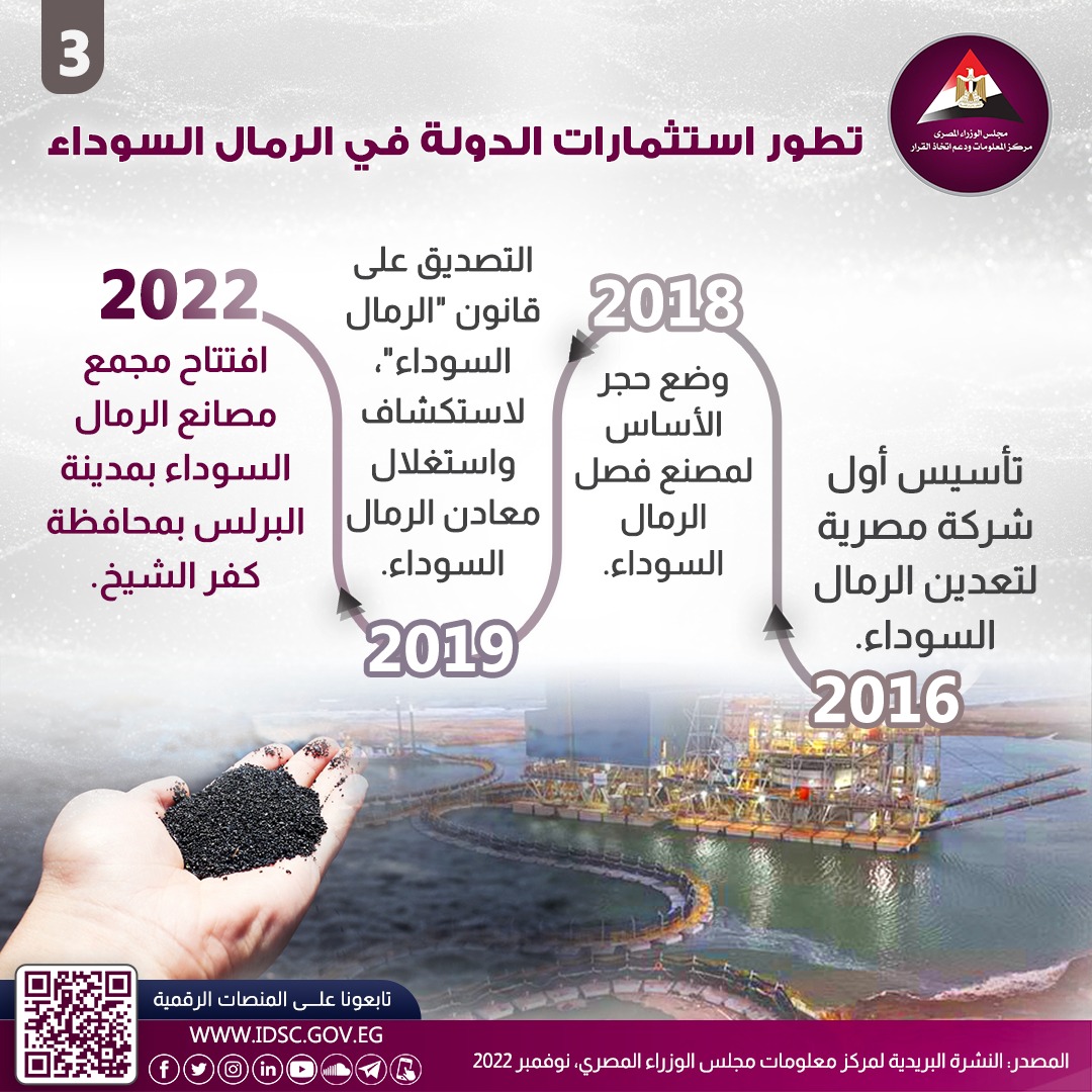 كما أشار الإنفوجرافيك إلى أبرز المراحل والتطورات التي مرت بها الدولة المصرية باستثمارها في الرمال السوداء، ففي عام 2016 تم تأسيس أول شركة مصرية لتعدين الرمال السوداء، وفي 2018 تم وضع حجر الأساس لمصنع فصل الرمال السوداء، وفي 2019 تم التصديق على قانون "الرمال السوداء"، لاستكشاف واستغلال معادن الرمال السوداء، وصولًا إلى افتتاح مجمع مصانع الرمال السوداء خلال عام 2022 بمدينة البرلس بمحافظة كفر الشيخ.