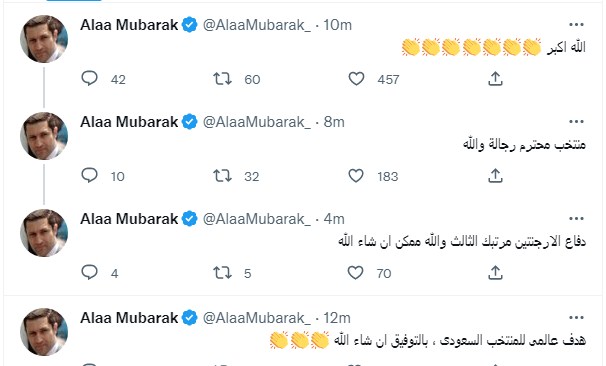 وجه علاء مبارك، نجل الرئيس الراحل حسني مبارك، رسائل للمنتخب السعودي، بعد إحراز المنتخب السعودي هدفه الثاني أمام الأرجنتين، وتمكن المنتخب السعودي من التقدم على نظيره الأرجنتيني بهدفين مقابل هدف، حيث وصف علاء مبارك الهدف السعودي بالعالمي، والمنتخب اسعودي بالمحترم، في حين وصف المنتخب الأرجنتيني بالمرتبك، وأن المنتخب السعودي بإمكانه إحراز الهدف الثالث.