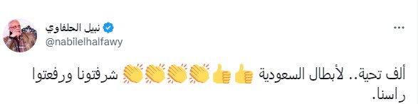 وعبر مشاهير الفن عن سعادتهم بفوز الفريق السعودي على منتخب الأرجنتين، فقال نبيل الحلفاوي "ألف تحية.. لأبطال السعودية شرفتونا ورفعتوا راسنا."