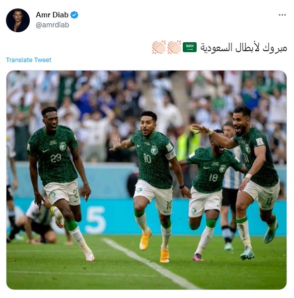 وعبر عمرو دياب عن سعادته بالمنتخب السعودي قائلًا: "مبروك لأبطال السعودية"