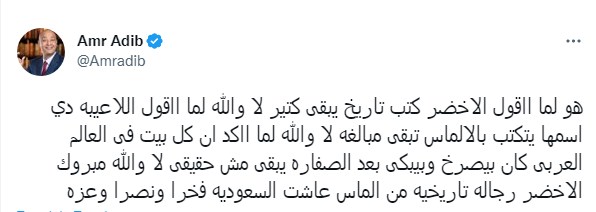وقال عمرو أديب "هو لما اقول الاخضر كتب تاريخ يبقى كتير لا والله لما اقول اللاعيبه دي اسمها يتكتب بالالماس تبقى مبالغه لا والله لما اكد ان كل بيت فى العالم العربى كان بيصرخ وبيبكى بعد الصفاره يبقى مش حقيقى لا والله مبروك الاخضر رجاله تاريخيه من الماس عاشت السعوديه فخرا ونصرا وعزه"