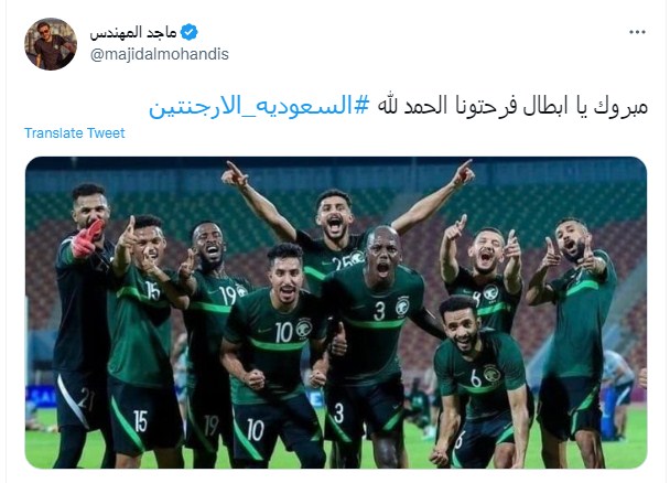 وأضاف ماجد المهندس "مبروك يا ابطال فرحتونا الحمد لله #السعوديه_الارجنتين"