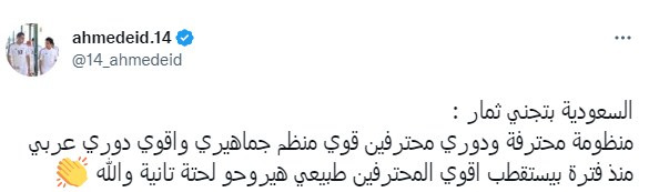 أما لاعب الزمالك السابق أحمد عيد فقال "السعودية بتجني ثمار: منظومة محترفة ودوري محترفين قوي منظم جماهيري واقوي دوري عربي منذ فترة بيستقطب اقوي المحترفين طبيعي هيروحو لحتة تانية والله"