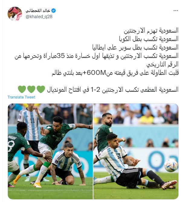 وقال المحلل الرياضي خالد القحطاني "السعودية تهزم الارجنتين السعودية تكسب بطل الكوبا السعودية تكسب بطل سوبر على ايطاليا السعودية تكسب الارجنتين وتذيقها اول خسارة منذ 35مباراة وتحرمها من الرقم التاريخي قلبت الطاولة على فريق قيمته من600M+بعد بلنتي ظالم السعودية العظمى تكسب الارجنتين 2-1 في افتتاح المونديال"
