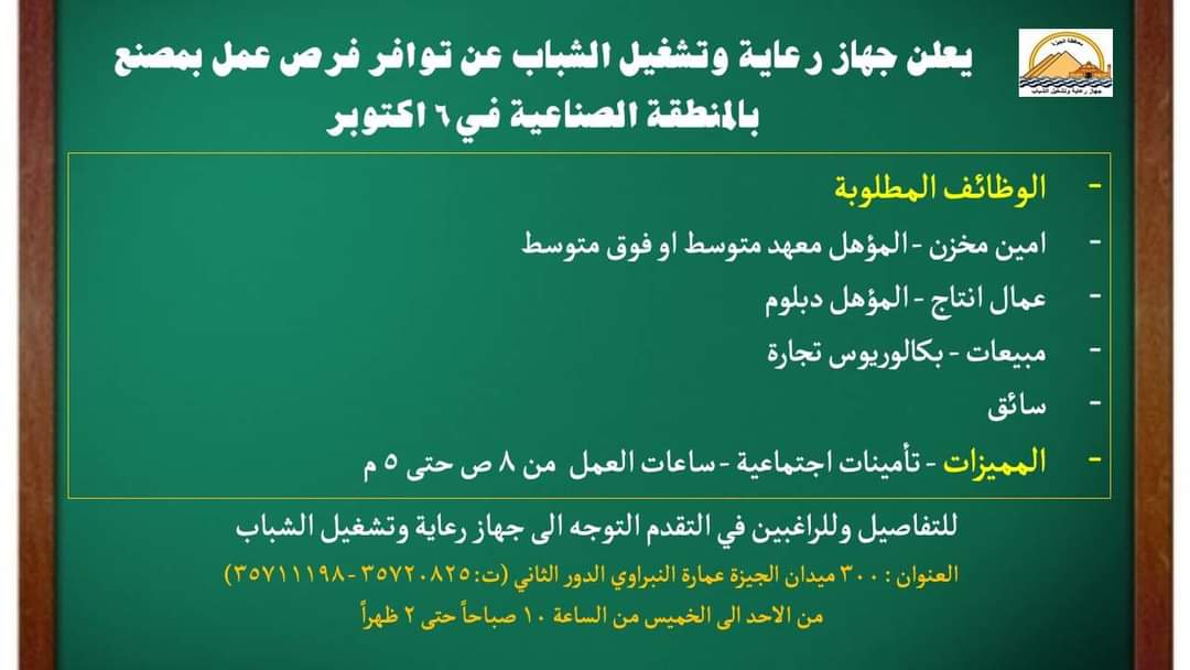 أعلن جهاز تشغيل الشباب بمحافظة الجيزة عن توافر فرصة عمل بمصنع في المنطقة الصناعية بالسادس من أكتوبر وحدد الجهاز أن الوظائف المطلوبة : أمين مخزن والمؤهل المطلوب معهد فوق المتوسط