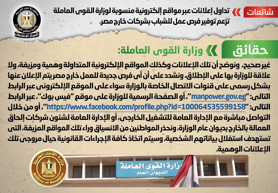 وتواصل المركز الإعلامي لمجلس الوزراء مع وزارة القوى العاملة، والتي نفت تلك الأنباء، مُؤكدةً أنه لا صحة للإعلانات المتداولة المنسوبة للوزارة، والتي تزعم توفير فرص عمل للشباب بشركات خارج مصر، مُوضحةً أن تلك الإعلانات وكذلك المواقع الإلكترونية المتداولة وهمية ومزيفة، ولا علاقة للوزارة بها على الإطلاق.