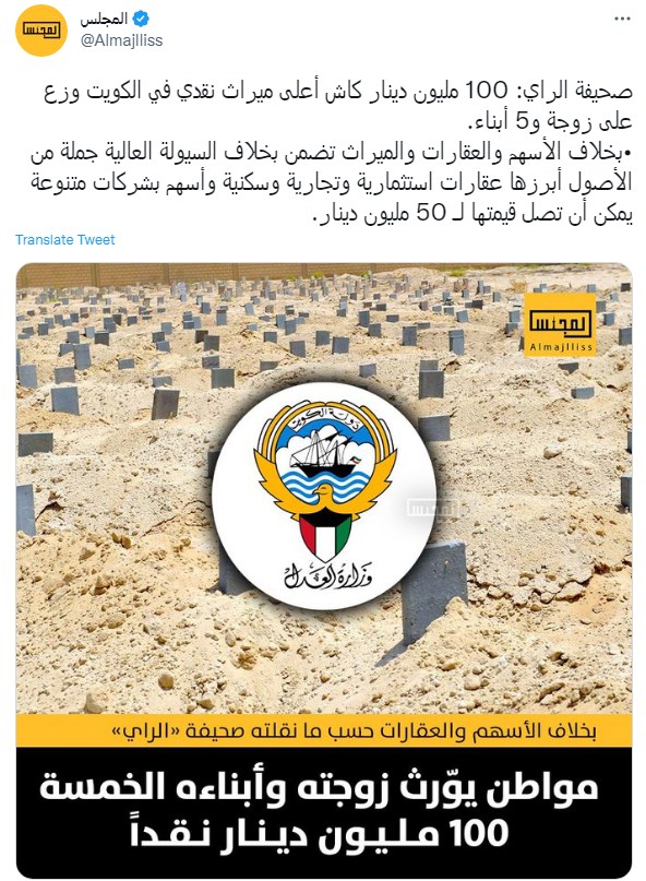 كويتي يورث أبناءه وزوجته 100 مليون دينار.. والنشطاء: يستاهل الرحمة من المجرات كلها