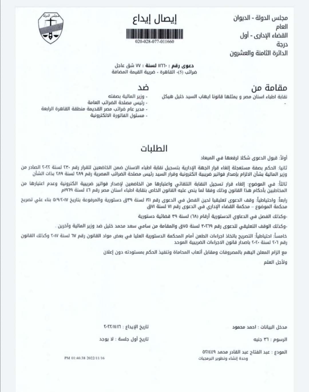 كما تضمنت الدعوى المقامة من نقابة الأسنان، إلغاء قرار تسجيل النقابة التلقائي، واعتبارها من الخاضعين لإصدار فواتير ضريبة إلكترونية، وعدم اعتبارها من المخاطبين بأحكام هذا القانون، وذلك وفقا لما ينص عليه القانون الخاص بنقابة أطباء أسنان مصر رقم 46 لسنة 1969م.