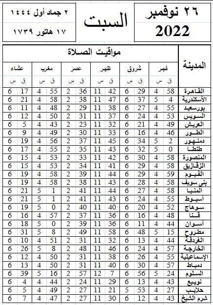 مواقيت الصلاة اليوم وفقًا للتوقيت المحلي لمدينتي القاهرة والإسكندرية وعدد من مدن ومحافظات الجمهورية من واقع بيانات الهيئة العامة للمساحة