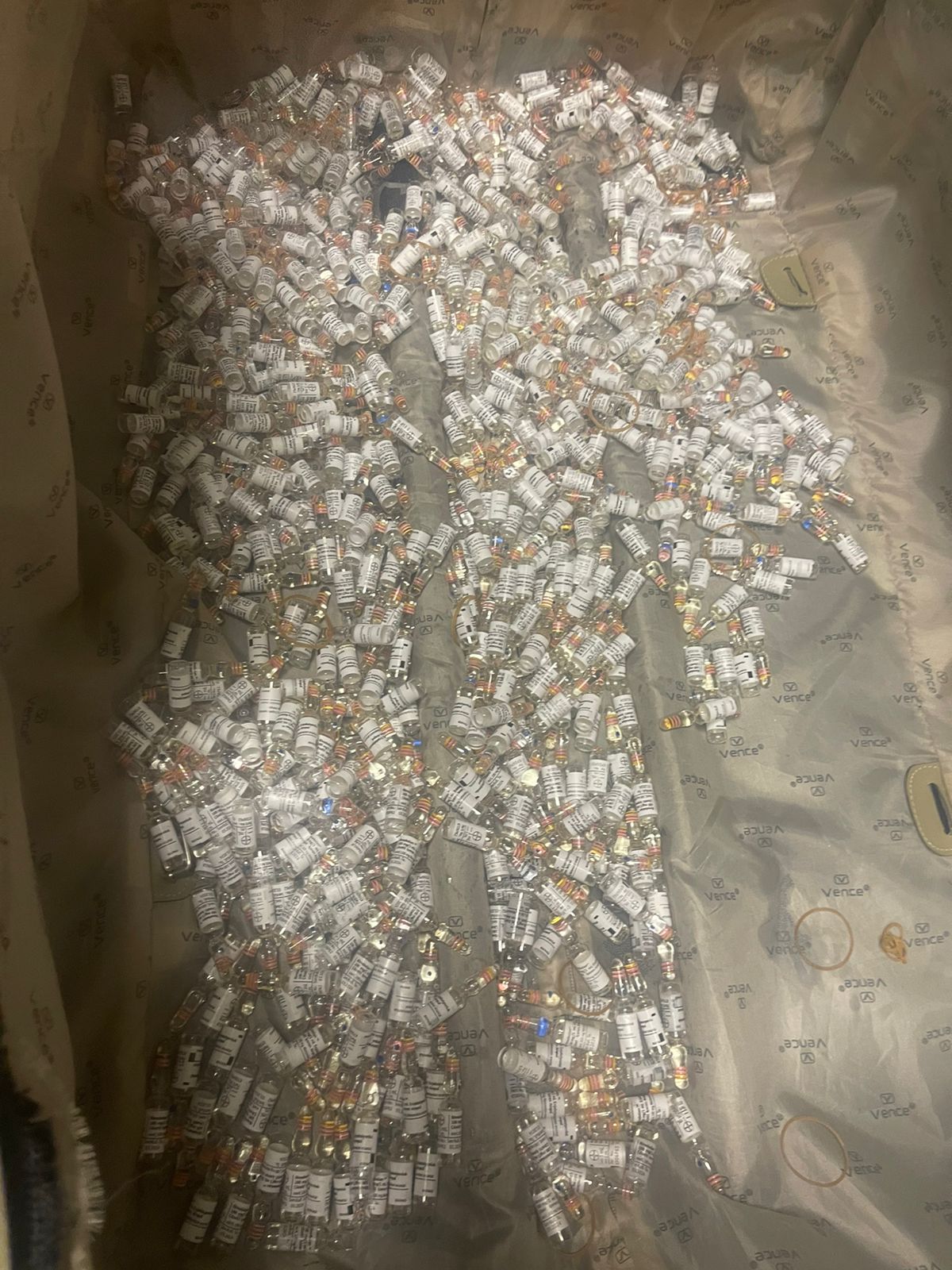 حيث تم ضبط ١٤ خزان زجاجي بداخلهم مادة THC المخدرة و٣ سجائر الكترونية تحتوي على نفس المادة المخدرة و٢ كيس حلويات بهم نفس المخدر وكيس بداخله "ماشروم" معجون بالمخدر و٥ أكياس بداخلهم كبسولات مخدرة بعدد ٢٠٣ كبسولة وزجاجة بداخلها زيت القنب المخدر.