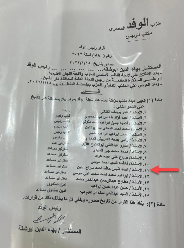 وقدم أنيس إلى المحقق كل المستندات الدالة على ثبوت عضويته بالهيئة الوفدية.. ومنها قرار رقم 77 والذي يقضى بتعيين احمد سراج الدين بلجنة بيلا التابعة لمحافظة كفر الشيخ بتاريخ 5 يناير 2022.