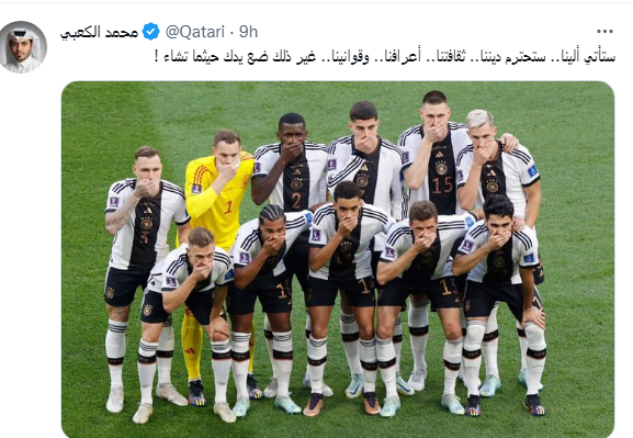 هاجم الإعلامي القطري محمد الكعبي، منتخب ألمانيا، بعد الصورة الجماعية للمنتخب الألماني قبل انطلاق مباراته أمام المنتخب الياباني التي أقيمت أمس الأربعاء في الجولة الأولى للمجموعة الخامسة ببطولة كأس العالم قطر 2022، وتظهر وضع اللاعبين أيديهم على أفواههم، في إشارة إلى منع السطات القطرية المنتخبات المشاركة في مونديال قطر 2022 بارتداء الشارات الخاصة بدعم المثليين.