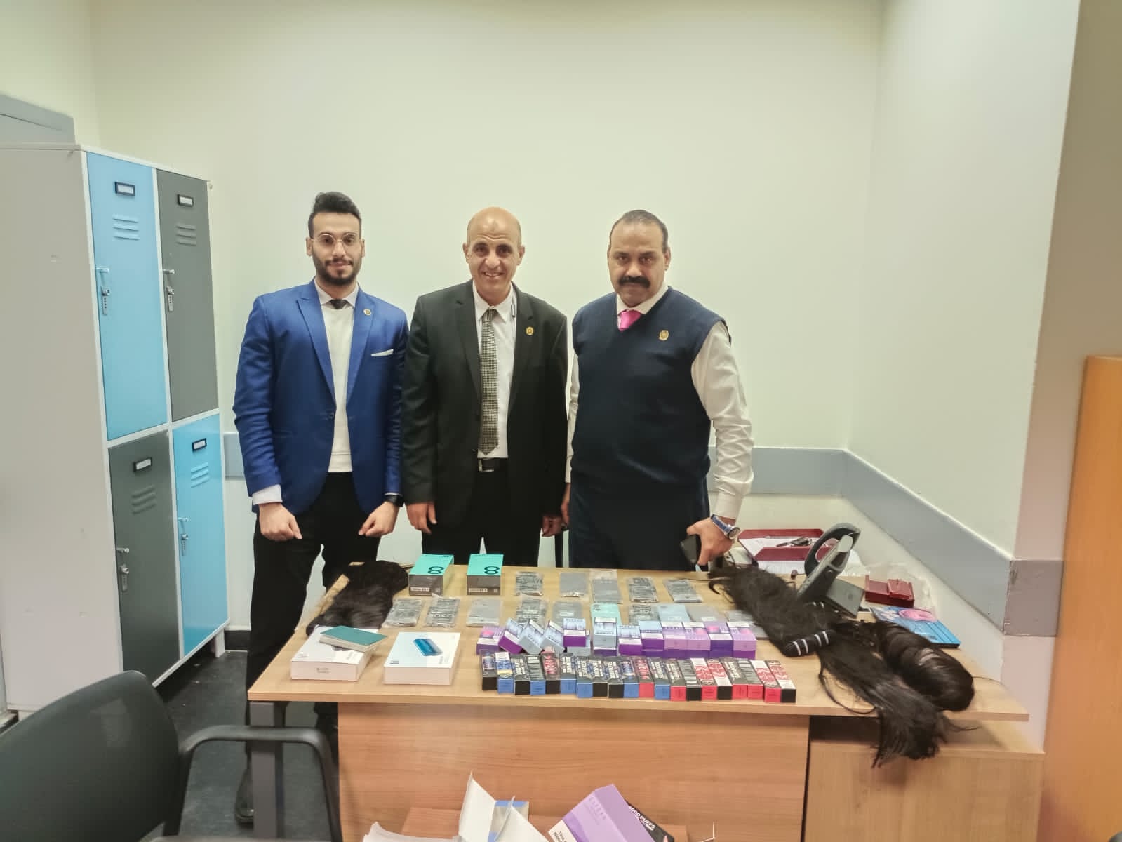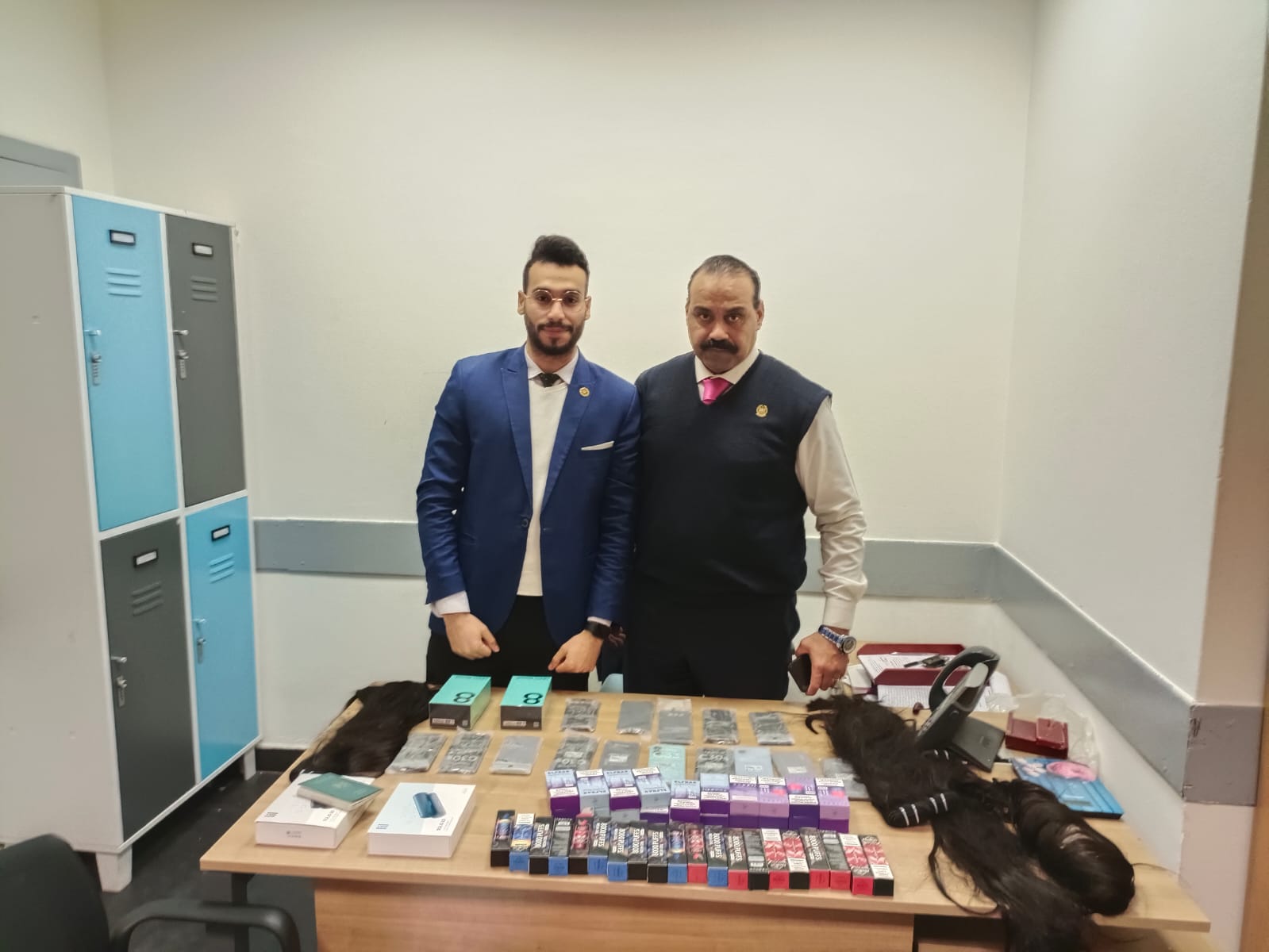 جسده كلمة السر.. إحباط محاولة تهريب هواتف محمولة وشيش وشعر مستعار بمطار القاهرة | صور