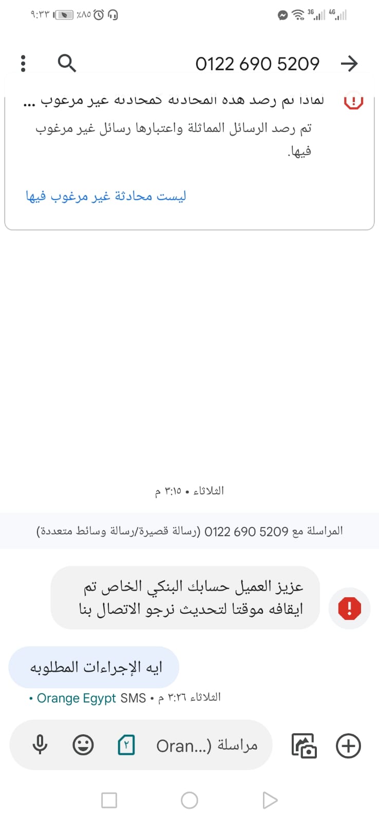 " جاتني رسالة بإيقاف الحساب البنكي واتصلت بالرقم مرسل الرسالة واخد كل البيانات الشخصية وبعدها تفاجئت برسالة خصم الرصيد من البنك".