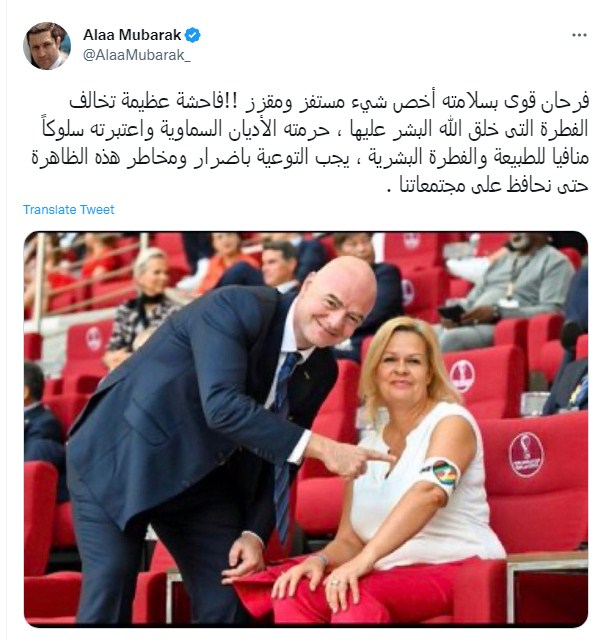 وجه علاء مبارك، نجل الرئيس السابق حسني مبارك، رسالة صادمة لرئيس الاتحاد الدولي لكرة القدم “فيفا” جياني إنفانتينو، بعد ظهوره مع وزيرة الداخلية الألمانية وتشجيعه لها وهي ترتدي شارة "المثلية" في مباراة المانيا واليابان، في مخالفة واضحة لقوانين الفيفا بشأن عدم ارتداء الشارة.