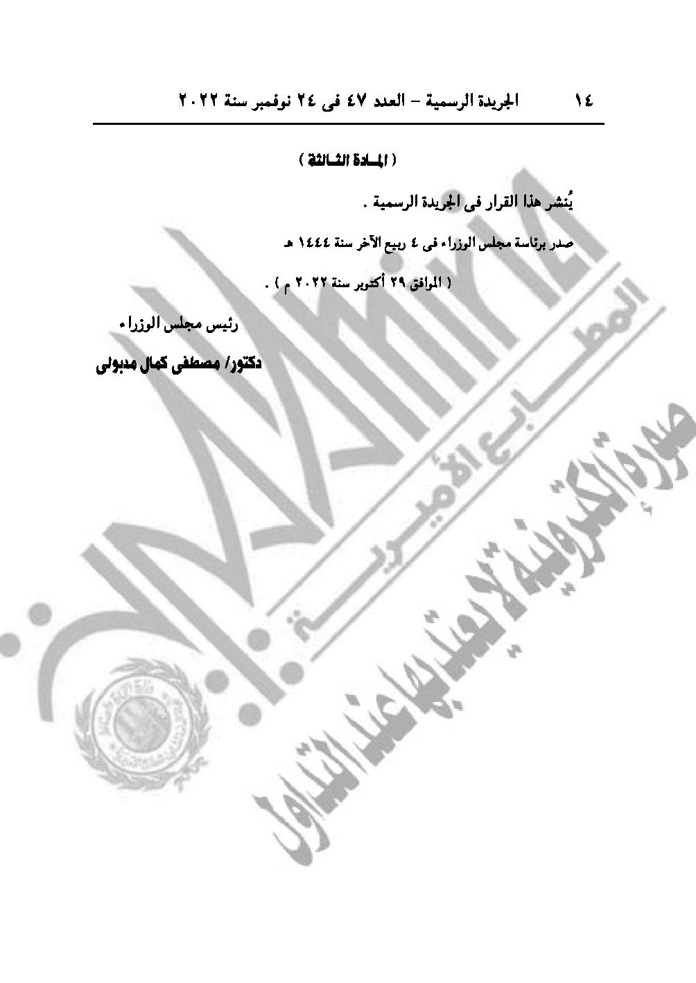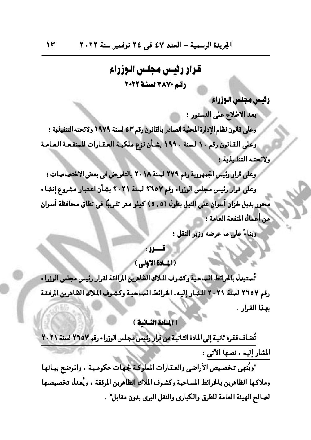 -القرار رقم 3870 لسنة 2022، باستبدال الخرائط المساحية وكشوف الملاك الظاهرين المرفقة بالقرار، بالخرائط المساحية وكشوف الملاك الظاهرين المرفقة لقرار رئيس مجلس الوزراء رقم 2657 لسنة 2021.
