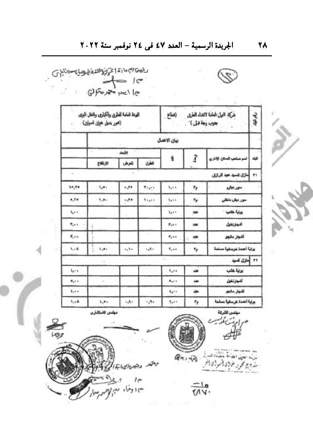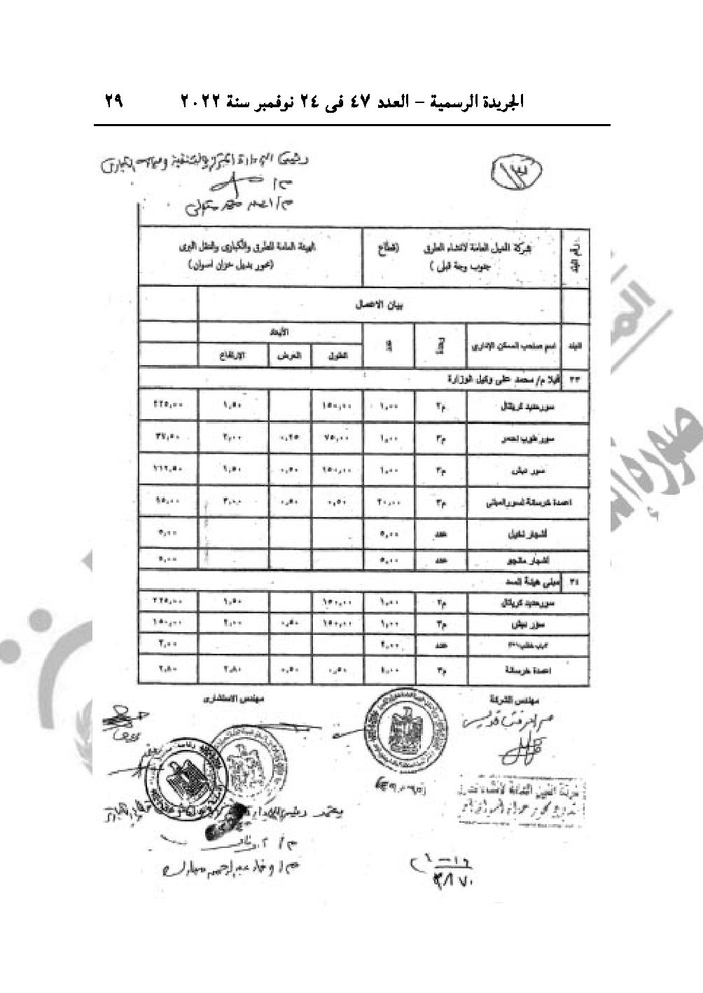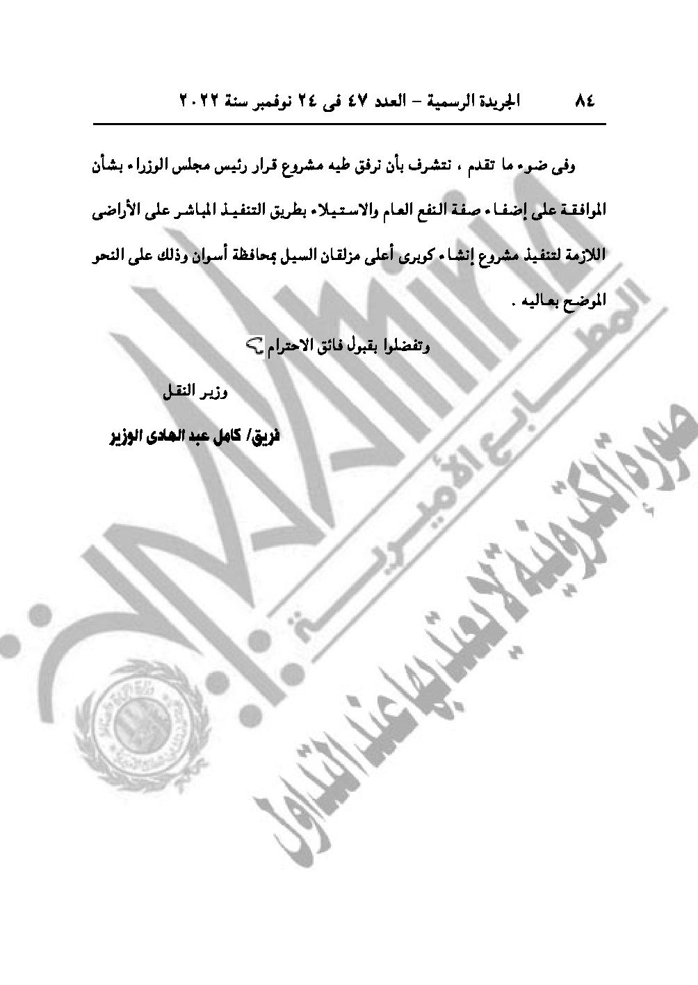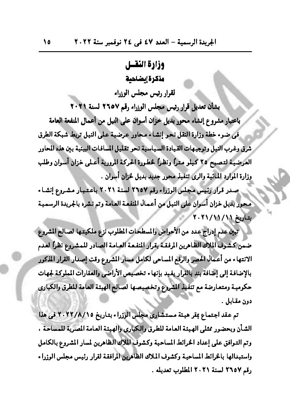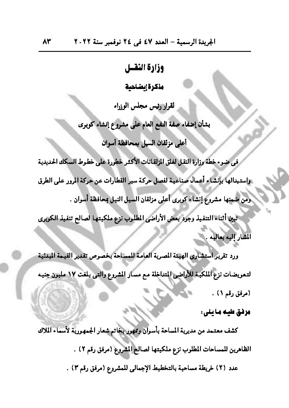 -والقرار رقم 3872 لسنة 2022، باعتبار مشروع إنشاء كوبري أعلى مزلقان السيل بمحافظة أسوان، من أعمال المنفعة العامة.