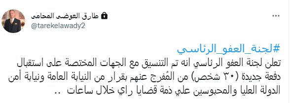 وكتب طارق العوضي تغريدة على تويتر قال فيها: “#لجنة_العفو_الرئاسي.. تعلن لجنة العفو الرئاسي انه تم التنسيق مع الجهات المختصة على استقبال دفعة جديدة (٣٠ شخص) من المُفرج عنهم بقرار من النيابة العامة ونيابة أمن الدولة العليا خلال ساعات”.