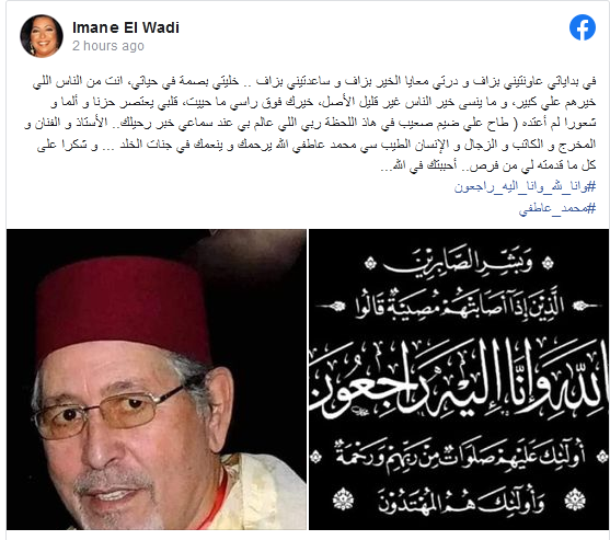 وزادت في تدوينة على حسابها في فيسبوك: "قلبي يعتصر حزنًا وألمًا وشعورًا لم أعتده.. الأستاذ والفنان والمخرج والكاتب والزجال والإنسان الطيب سي محمد عاطفي الله يرحمك وينعمك في جنات الخلد... وشكرًا على كل ما قدمته لي من فرص.. أحببتك في الله".