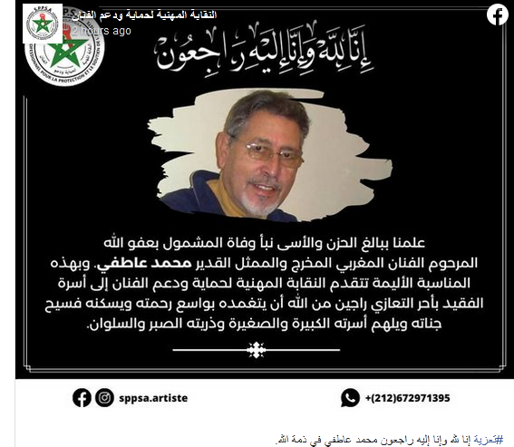 بدورها، قدمت النقابة المهنية لحماية ودعم الفنان، تعازيها في وفاة "عاطفي"، قائلة: "علمنا ببالغ الحزن والأسى، نبأ وفاة المشمول بعفو الله لمرحوم الفنان المغربي المخرج والممثل القدير محمد عاطفي".