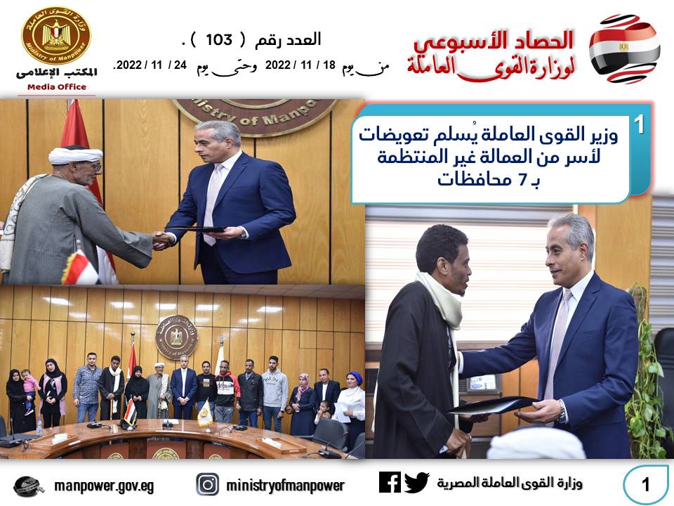وخلال الاسبوع سَلّم وزير القوى العاملة حسن شحاتة بديوان عام الوزارة، شيكات تعويض وثائق التأمين ضد الحوادث الشخصية لـ 8 أسر لعمال متوفين من العمالة غير المنتظمة ومصاب، بإجمالى مبلغ 782 ألف و 979 جنيه، مقدمة من شركة مصر للتأمين كتعويض من خلال وثيقة التأمين لحالات العجز الجزئي أو الكلي أو الوفاة، والتى أصدرتها "الوزارة "بالتعاون مع "الشركة" لحماية العمالة غير المنتظمة وأسرهم ورعايتها اجتماعيًا وصحيًا.