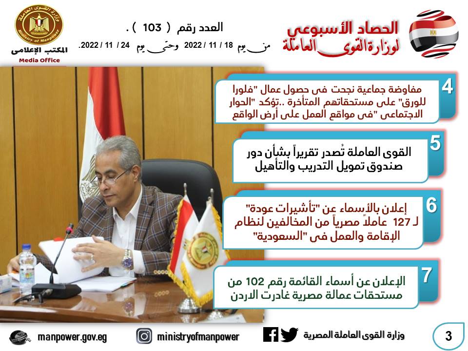 وفي اطار تواصلها مع عمال مصر في الخارج وحماية حقوقهم وأمنهم وإستقرارهم،أعلنت وزارة القوى العاملة وبالاسماء،عن قيام مكتب التمثيل العمالي التابع لها بالرياض بتسهيل إجراءات حصول 127 عاملًا مصريًا من المخالفين لنظام الإقامة والعمل في المملكة العربية السعودية،على تأشيرات للعودة إلى مصر.