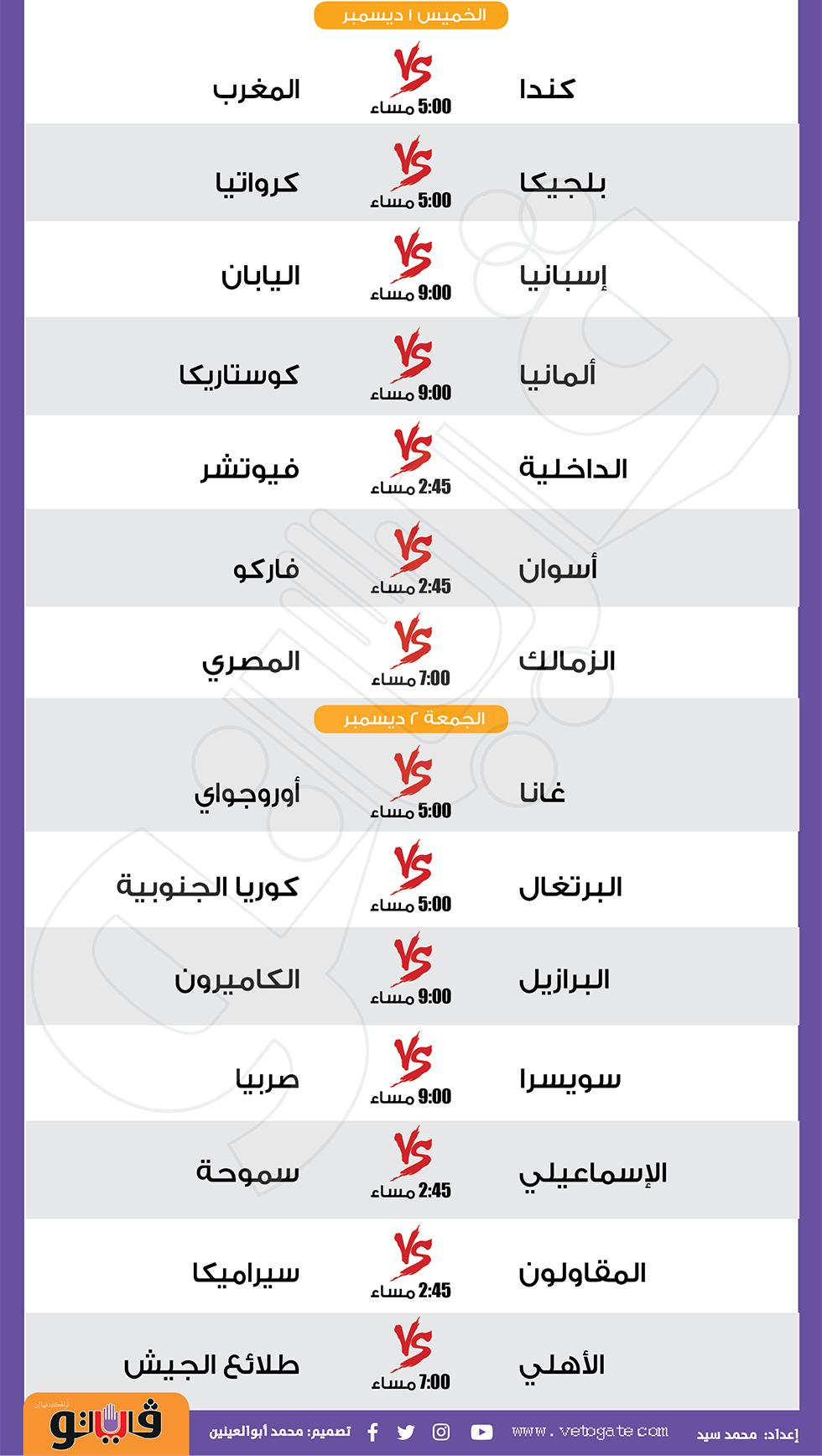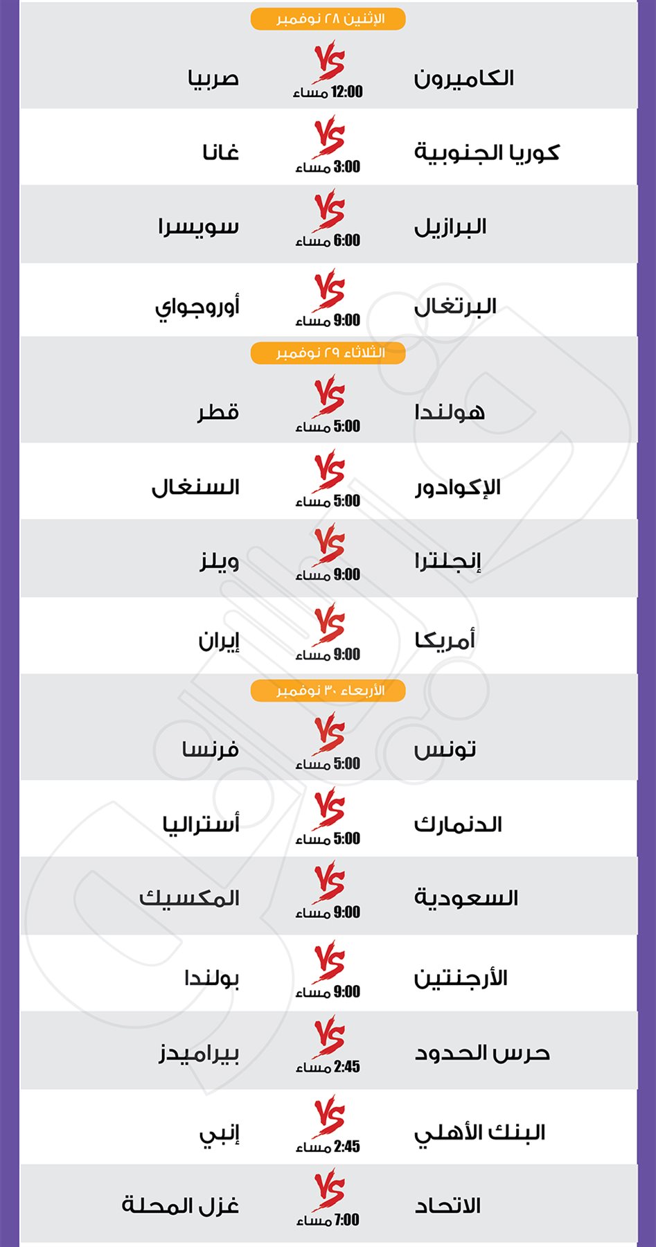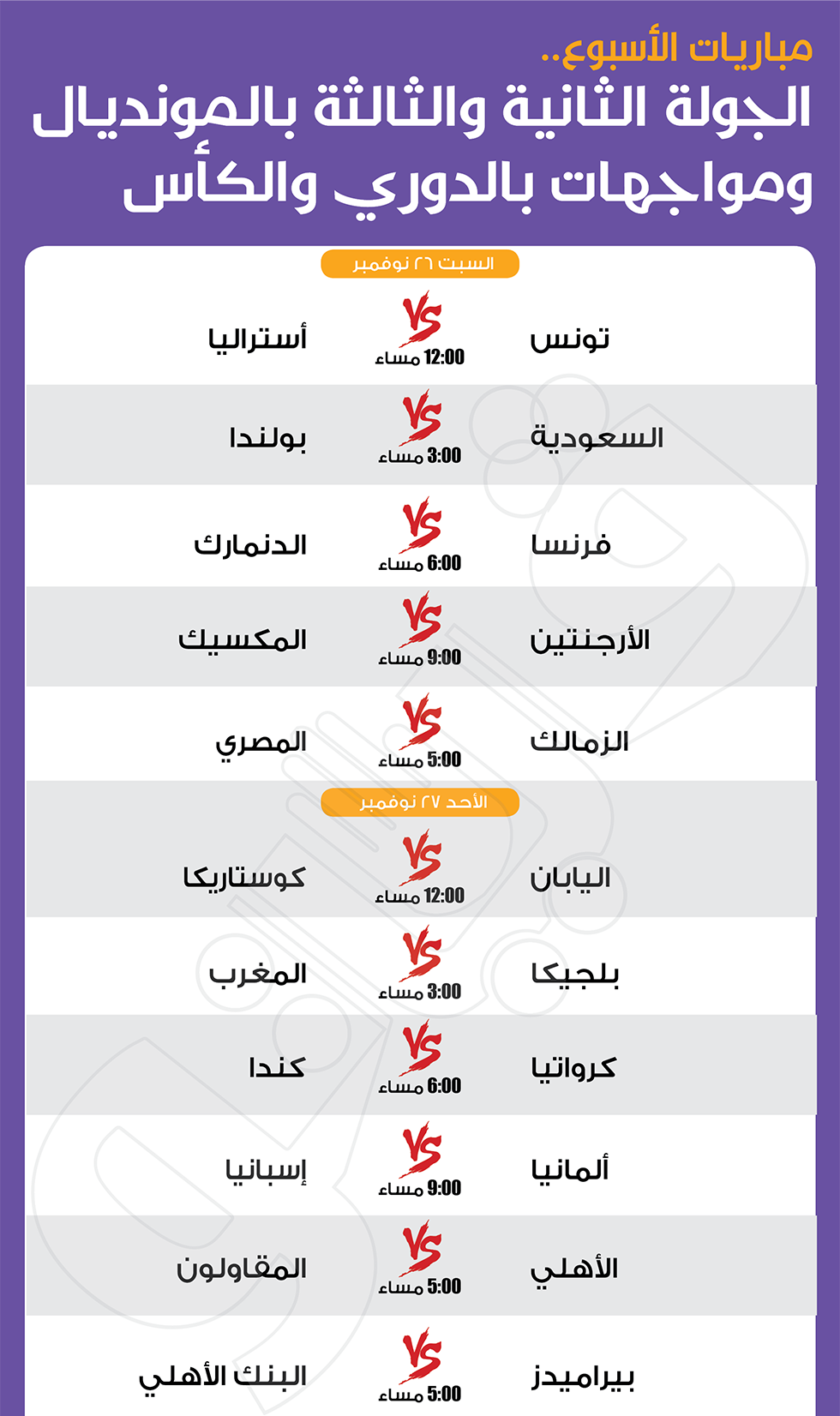 الجولة الثانية والثالثة بالمونديال ومواجهات بالدوري والكأس|إنفوجراف الجمعة 25/نوفمبر/2022 - 11:59 م 11/25/2022 11:59:50 PM كأس العالم محمد سيد شارك طباعة 18 حجم الخط شارك طباعة الأرجنتين البرتغال البرازيل اسبانيا ألمانيا السعودية الأهلي الزمالك فرنسا