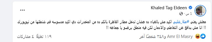 وعلق الشاعر الغنائي خالد تاج الدين على خبر القبض علي الفنانة منة شلبي من خلال حسابه الشخصي عبر موقع “فيس بوك”، قائلا: معلش يعني منة شلبي أكيد مش بالغباء عشان تدخل مطار القاهرة بالكم ده من المخدرات دي أكيد مدسوسة في شنطتها من نيويورك.