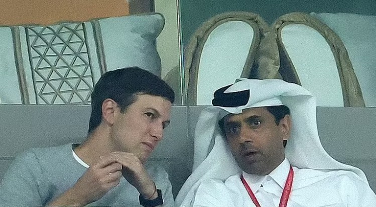 وفي لقطات أخرى، شوهد زوج إيفانكا وهو يتحدث إلى رئيس شبكة "بي إن سبورت" القطري ناصر الخليفي.