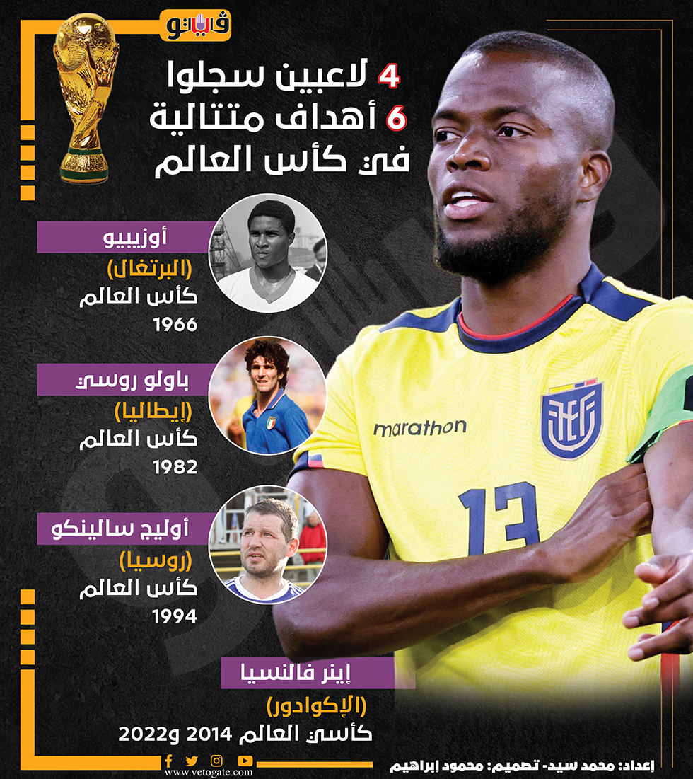 4 لاعبين سجلوا 6 أهداف متتالية في كأس العالم| إنفوجراف السبت 26/نوفمبر/2022 - 08:26 م 11/26/2022 8:26:59 PM إينر فالنسيا محمد سيد شارك طباعة 18 حجم الخط شارك طباعة الإكوادور البرتغال أوزيبيو إينر فالنسيا باولو روسي كأس العالم أوليج سالينكو روسيا