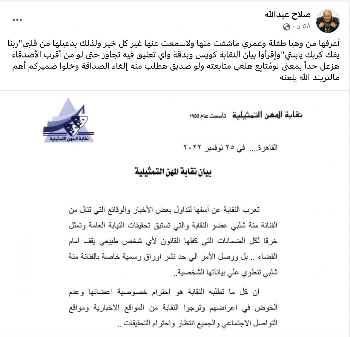 دعم الفنان صلاح عبد الله الفنانة منة شلبي في أزمتها ونشر على صفحته عبر موقع فيس بوك بيان نقابة المهن التمثيلية وعلق قائلًا: "أعرفها من وهيا طفلة وعمري ماشفت منها ولا سمعت عنها غير كل خير ولذلك بدعيلها من قلبي"ربنا يفك كربك يا بنتي"، واقرأوا بيان النقابة كويس وبدقة وأي تعليق فيه تجاوز حتى لو من أقرب الأصدقاء هزعل جدًا بمعنى لومُتابِع هلغي متابعته ولو صديق هطلب منه إلغاء الصداقة وخلوا ضميركم أهم ما التريند الله يلعنه".