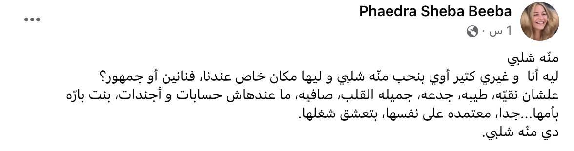 وكتبت فيدرا منذ قليل “منّه شلبي.. ليه أنا وغيري كتير أوي بنحب منّة شلبي وليها مكان خاص عندنا، فنانين أو جمهور؟ علشان نقيّة، طيبة، جدعة، جميلة القلب، صافية، ما عندهاش حسابات وأجندات، بنت بارّة بأمها...جدا، معتمدة على نفسها، بتعشق شغلها. دي منّة شلبي".