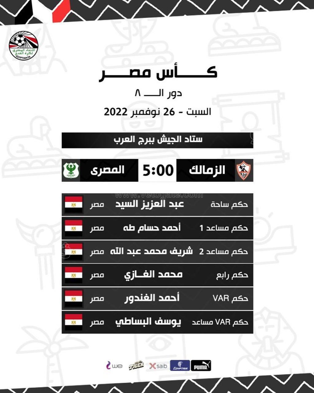 أعلن الاتحاد المصري لكرة القدم عن طاقم التحكيم بقيادة عبدالعزيز السيد الذي سيخوض مواجهة الزمالك والمصري في دور 8 من بطولة كأس مصر المبارة التي ستقام غدا على ستاد برج العرب في الخامسة مساء.