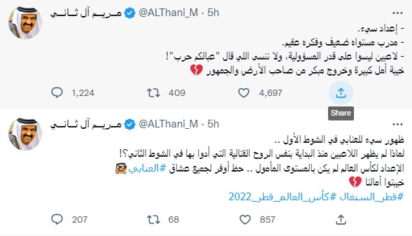 وأعربت الشيخة مريم آل ثاني على موقع التغريد العالمي تويتر، عن غضبها وخيبة الأمل بسبب الأداء الضعيف للمنتخب القطري، وخروجه مبكرا من نهائيات بطولة كأس العالم لكرة القدم 2022.