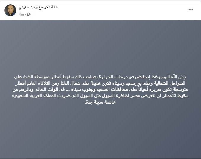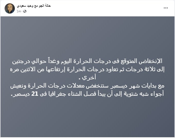 وكتب وحيد سعودي تدوينة على الفيس بوك قال فيها:"الإنخفاض المتوقع فى درجات الحرارة اليوم وغدًا حوالي درجتين إلى ثلاثة درجات ثم تعاود درجات الحرارة إرتفاعها من الاثنين مره أخري."