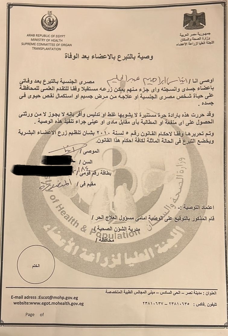 بدأ عدد من أعضاء لجنة الصحة بمجلس النواب، التوقيع على وصية التبرع بالأعضاء عقب الوفاة، حيث أعلنت النائبة إيناس عبد الحليم، رئيس لجنة قانون التبرع بالأعضاء بلجنة الصحة، تبرعها بأعضائها بعد الوفاة.