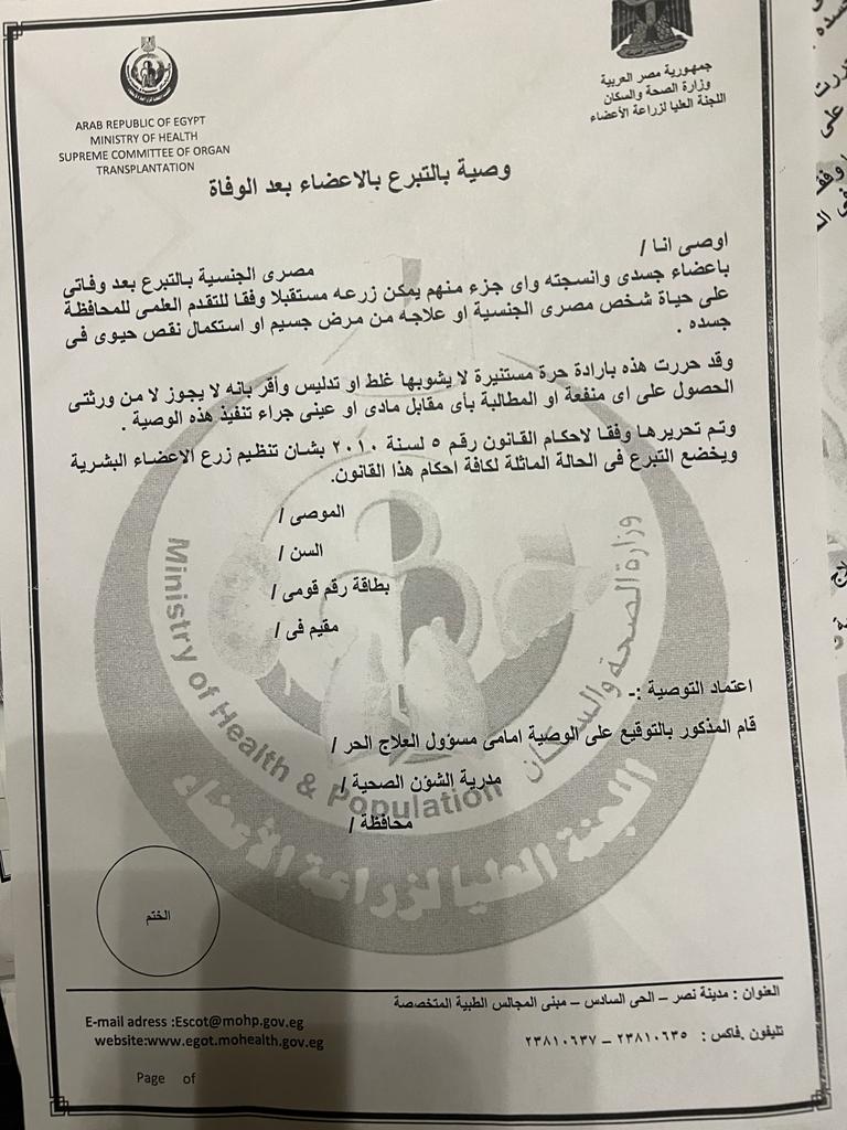 وقامت النائبة بالتوقيع على وثيقة توصية للتبرع بالأعضاء كأول وثيقة صادرة للتبرع، حيث جاء فيها: "أوصي بالتبرع بعد وفاتي بأعضاء جسدي وأنسجته وأي جزء منهم يمكن زرعه مستقبلا وفقا للتقدم العلمي، للمحافظة على حياة شخص مصري الجنسية، أو علاجه من مرض جسيم أو استكمال نقص حيوي في جسده، وقد حررت هذا بإرادة حرة، ولا يجوز لورثتي الحصول على أي منفعة أو المطالبة بأي مقابل مادي أو عيني جراء هذه الوصية".