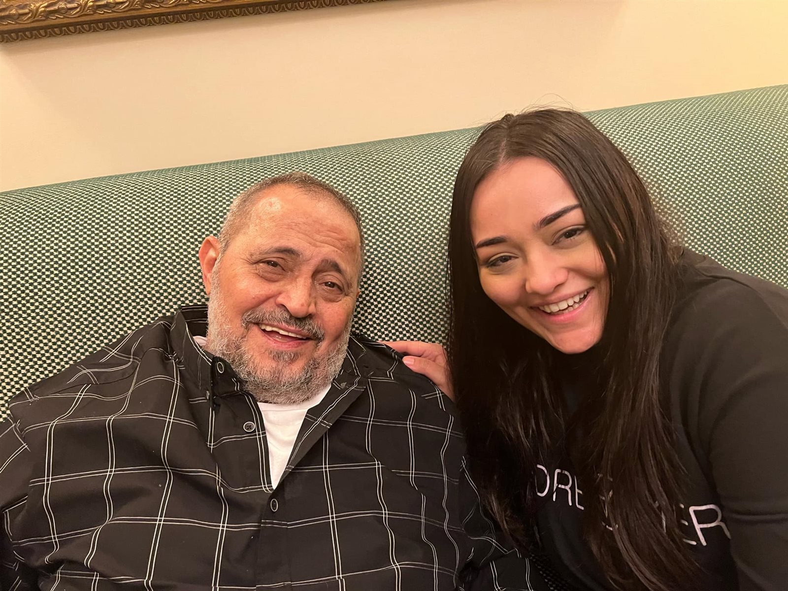 وتابعت:" حب عمري.. حب الطفوله والمراهقة والشباب ولحد الإدراك وسني الحالي.. حلمي إتحقق وشوفتك يا چورچ.. بحبك يا ابو وديع ربنا يمد في عمرك ويديلك من فضله ويديلك كل اللي بتتمناه ويخليك الي بيحبوك ويخلهم ليك يارب اللهم آمين ويباركلنا في عمرك وصحتك".