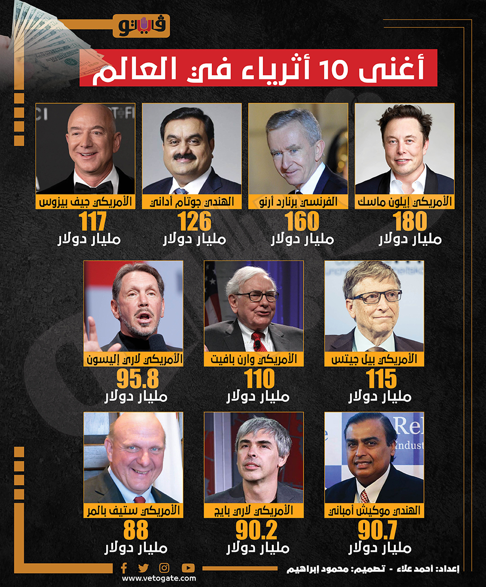 أغنى 10 أثرياء في العالم | إنفوجراف الإثنين 28/نوفمبر/2022 - 11:13 م 11/28/2022 11:13:07 PM إيلون ماسك على رأس قائمة أغنى 10 أشخاص في العالم شارك طباعة 18 حجم الخط شارك طباعة أغنى 10 أثرياء في العالم إيلون ماسك برنارد ارنو جوتام أداني جيف بيزوس بيل جيتس